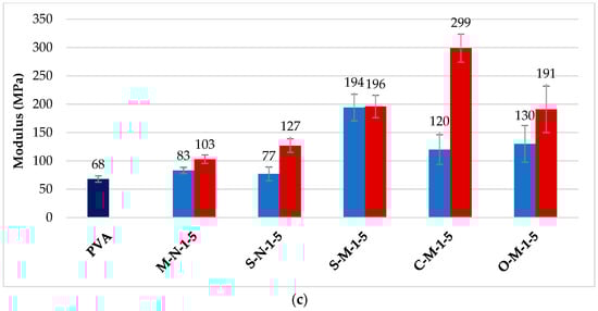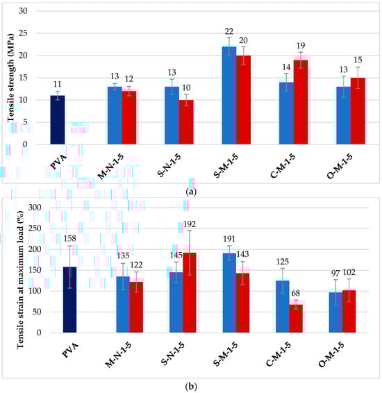 The tensile strain results are shown in Figure 6b, where the dark blue bar is the PVA control, the light blue bars are composites with 1% reinforcement, and the red bars are composites with 5% reinforcement. As observed in the graph, the tensile strain of most samples, except for two, decreased when compared with the unreinforced PVA film. The minimum strain, 68%, is observed in the case of C-M-5. This significant decrease is due to the carboxylate bonds at the fiber interface, which make the interface stronger but more brittle. On the other hand, the maximum strain, 192%, is observed in the case of S-N-5 and S-M-1. These values indicate more plastic behavior, with extensive plastic deformation and slippage at the fiber–matrix interface. Therefore, depending on the specific application, the appropriate sample can be selected to achieve the desired mechanical response [68,69].