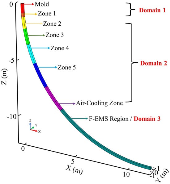 This study divides the three-dimensional multiphysics coupled model into three computational domains based on the flow and solute transport phenomena in different regions during the continuous casting process. The geometric model division method is illustrated in Figure 1. The mold region and Zone 1 of the secondary cooling zone are grouped as Domain 1. This is due to the consideration of the effect of M-EMS and the jet action of molten steel entering the mold at a high speed from the submerged entry nozzle (SEN), leading to the formation of forced convection in this area. Domain 2 is defined by dividing Zone 2 to Zone 5 of the secondary cooling zone and a portion of the air-cooling zone. This division is motivated by the fact that after the molten steel exits the forced convection zone, its flow is mainly driven by gravity in this region, where convection is primarily induced by thermal and solutal buoyancy. Including a portion of the air-cooling zone in Domain 2 is to optimize computational resources and enhance efficiency since significant computational resources are required for magnetic field and electromagnetic force calculations. The outlet of Domain 2 is set approximately 1 m away from the length of F-EMS to conserve computational resources. Domain 3 is designated for the F-EMS action region, focusing on the forced convection effect induced by F-EMS.
