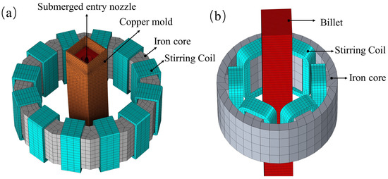 Figure 2 displays the geometric model and meshing of the regions affected by M-EMS and F-EMS. M-EMS comprises 12 coils, divided into six groups, with each group carrying current in the same phase. The phase difference between each group is 120°. F-EMS consists of 6 coils and, thus, no grouping is needed. The three-phase current input method is the same as that of M-EMS. Hexahedral meshing is employed for both the billet and the electromagnetic stirrer. However, when calculating the magnetic field generated by EMS, meshing is applied to the surrounding air domain. Due to the complexity of the geometric model, adaptive tetrahedral meshing is used for meshing the air domain and the copper mold. The total number of meshes for the three computational domains is approximately 3.5 million, and the installation positions of M-EMS and F-EMS are listed in Table 1.