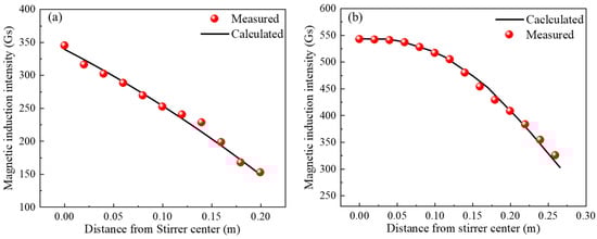 Comparison of measured and calculated magnetic induction intensity: (a) M-EMS; (b) F-EMS.