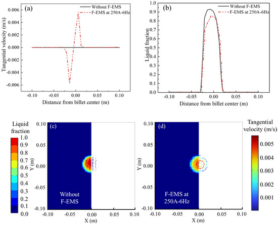 Figure 7 illustrates the impact of F-EMS on the liquid fraction and tangential velocity, with results obtained under the operation of M-EMS at 250A-2Hz. In Figure 7a, the tangential velocity on the central cross-section with and without F-EMS is compared. It can be observed that without F-EMS, there is almost no rotational convection in the molten steel, resulting in a nearly zero tangential velocity. However, with F-EMS operating at 250A-6Hz, a significant rotational flow is generated in the molten steel in the solidification end, with a maximum tangential velocity of approximately 0.006 m/s. Figure 7b compares the influence of F-EMS on the distribution of liquid fraction. It is evident that the addition of F-EMS significantly reduces the central liquid fraction, decreasing from 0.93 without F-EMS to 0.85. This reduction is attributed to F-EMS promoting convection in the late stage of solidification, thereby accelerating heat dissipation. Figure 7c,d contrast the distribution of liquid fraction and the vector plot of tangential velocity on the Z = −9.23 m cross-section with and without F-EMS. Without F-EMS stirring, the convection in the molten steel in the late stage of solidification is mainly due to the action of thermal solutal buoyancy. In the vector plot on the right side in Figure 7c, weak circulation can be observed, where the magnitude of the tangential velocity is approximately 10−7 m/s. This is because the size of the molten steel in the late-stage liquid phase limits the development of flow, and the decreased steel temperature leads to a smaller thermal solutal buoyancy, resulting in weak convection at this location. Figure 7d shows the situation under F-EMS with operating parameters at 250A-6Hz. A clockwise rotational flow pattern is clearly visible on this cross-section, and the maximum tangential velocity occurs at the position of the solidification front (approximately ). This phenomenon is attributed to the fact that both electromagnetic force and solidification resistance increase with the distance from the center of the billet. At , the solidification resistance reaches its maximum. Under the combined action of these two forces, this phenomenon occurs.