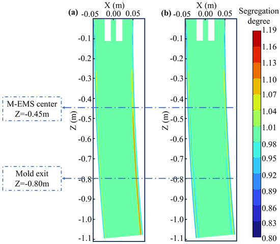 In the presence and absence of M-EMS, the carbon distributions on the central longitudinal section (Y = 0) of Domain 1 are shown in Figure 8. Without EMS, due to the lower solubility of carbon in the solid phase compared to the liquid phase, carbon is expelled into the molten steel. As a result, the initial solidifying shell has a lower carbon concentration, leading to a slight negative segregation, with a segregation index of approximately 0.92. In the subsurface, the combined effect of rising circulation and thermal solutal buoyancy causes higher carbon concentration steel to gather near Z = −0.3 m. As solidification progresses and the diffusion coefficient of carbon in the solid phase is small, a positive segregation layer is formed. The solute distribution in the curved model is asymmetrical, with stronger “washing effects” on the outer arc side compared to the inner arc side. Along the outer arc side, the positive segregation is reduced due to the washing effect of molten steel, resulting in a smaller positive segregation degree compared to the inner arc side, as shown in Figure 8a. When M-EMS operates at 250A-2Hz, the solute distribution undergoes changes. The positive segregation on the inner arc side is noticeably reduced. Due to the circulation formed by M-EMS, there is a slight negative segregation layer outside the positive segregation zone below the M-EMS installation position. The negative segregation index is approximately 0.95, as shown in Figure 8b. The positions of the M-EMS center and the mold exit are marked in Figure 8. The carbon distribution results on the cross-section of Domain 1 will be compared at these two positions.