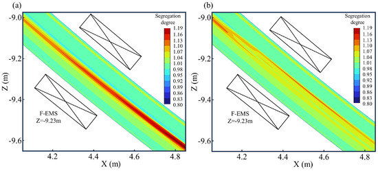 The carbon distributions near the F-EMS region are illustrated in Figure 10. Figure 10a shows that in the absence of EMS, carbon tends to accumulate significantly in the liquid phase pool during the final stages of solidification. After complete solidification, carbon in the central region cannot diffuse, resulting in severe central macrosegregation issues on the cross-section, as indicated by the carbon distribution cloud map after complete solidification in Figure 4c. Figure 10b depicts the carbon distribution cloud map on the longitudinal section when there is no M-EMS, and F-EMS operates at 250A-6Hz. It is evident that F-EMS significantly improves the solute distribution in the liquid phase pool during the final stages of solidification. The stirring effect from F-EMS contributes to a more uniform distribution of solute in the liquid phase pool. It is worth noting that F-EMS, as revealed in this study, has a pronounced improvement effect on central macrosegregation issues, which differs from the results obtained by Wang et al. [26]. This disparity can be attributed to the appropriate installation of F-EMS in this study at a position where carbon solutes accumulate significantly. In Wang et al.’s study, the F-EMS action region was too forward (approximately Z = −10.2 m), while, based on their solute distribution results, the location where carbon accumulated significantly during the final stages of solidification was approximately Z = −15 m. This improper installation of F-EMS in Wang et al.’s study might have led to suboptimal stirring effects, allowing solutes to still accumulate significantly during the final stages of solidification, resulting in central macrosegregation.
