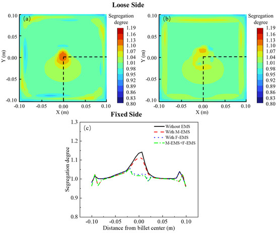 In the cross-section at Z = −11 m, where the billet has completely solidified, the carbon distributions under different EMS modes are illustrated in Figure 11. The parameters for M-EMS are set at 250A-2Hz, while F-EMS operates at 250A-6Hz. Figure 11a depicts the carbon segregation with only M-EMS. A noticeable center segregation issue persists, indicating that the effectiveness of M-EMS in addressing the center segregation problem is limited. Figure 11b shows the carbon distribution with only F-EMS. The introduction of F-EMS significantly reduces the carbon concentration in the central liquid pool, with even a slight negative segregation at the edges of the center. Figure 11c compares the carbon segregation indices under different agitation modes, with sampling locations consistent with those in Figure 11a,b. From the graph, it is evident that without EMS, the center segregation problem is most severe, with the maximum carbon segregation index along the sampling line reaching 1.15. With only M-EMS, besides changes in the carbon distribution within the initial solidification shell formed in the mold, there is a reduction in carbon concentration at the center, yielding a maximum carbon segregation index of approximately 1.11, a decrease of 0.04 compared to the case without EMS. In the case of only F-EMS, aside from a significant reduction in carbon concentration within the central liquid pool, there is no change in the carbon distribution at other locations. At this point, the carbon segregation index at the center is approximately 1.02, indicating a noticeable improvement in the center segregation problem. The impact of M+F-EMS on carbon segregation is presented in Figure 12.