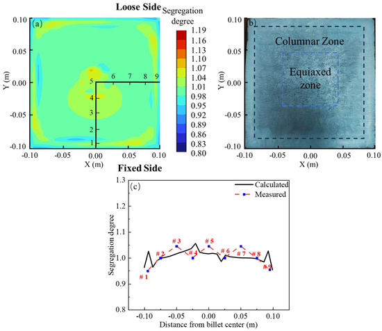 where represents the carbon concentration at the point, wt.%. stands for the average carbon concentration at each sampling point in the experiment and is the initial carbon concentration in the molten steel in the simulation, wt.%. When , it indicates positive segregation, and when , it indicates negative segregation.