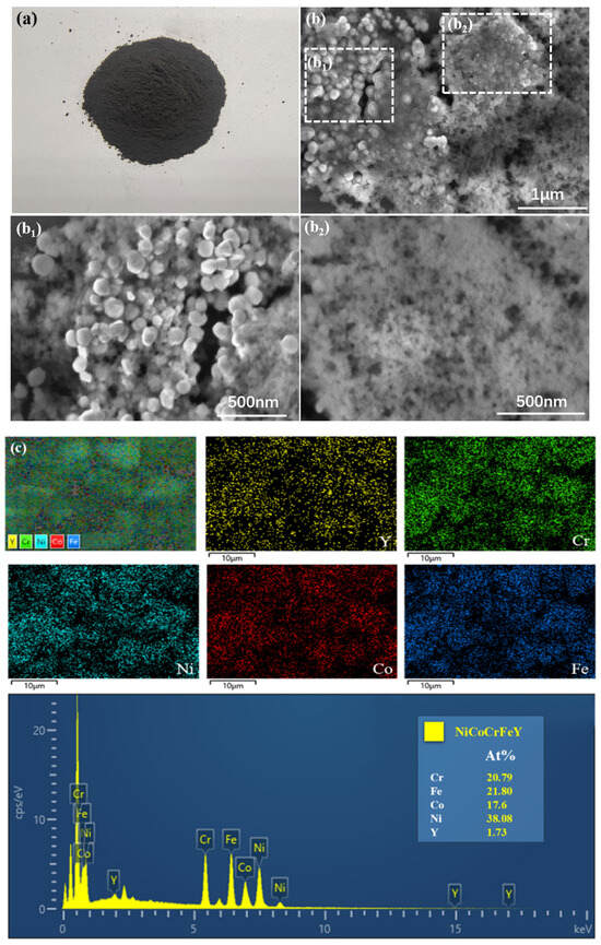 The prepared high entropy alloy powders were black (Figure 2a), and the test of the high entropy alloy powder close to a permanent magnet showed that the powder already has soft magnetic properties. The particle size of the powders were about 100 nm, spherical (Figure 2b). Further EDS surface scanning (Figure 2c) showed that the powders were composed of Ni, Fe, Co, Cr, and Y elements, with some powders mainly composed of Fe and Ni, and the other part consisting of Fe, Ni, Co, Cr, and Y. This was because the Ni content was higher than that of other elements, so Fe and Ni first reacted to form FeNi3 phase. As the Ni content decreased to a concentration similar to that of other elements, small particle size powders were generated as FeNiCoCrY alloy powders. In addition, the maximum equilibrium phase formula given by the Gibbs phase rule is p = n + 1, where p represents the number of coexisting phases in equilibrium and n represents the number of independent components in the alloy. The formula for non-equilibrium states is p > n + 1, while for high entropy alloys, the number of phases obtained is much smaller than the number of components in the alloy (i.e., p < n + 1). In this article, the p-value was 2 and the n-value was 5, indicating the successful preparation of high entropy alloys.