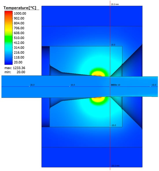 The purpose of the numerical calculatons was to determine the temperature distribution in a drawing set consisting of a tungsten carbide insert and a C45 steel housing, which is cooled with water on the side of the cylindrical surface. A constant water temperature, 20 °C, was assumed in the calculations due to its circulation in the cooling system. The drawing speed was assumed to be 5 m/s. As a result of the performed modelling, the temperature distribution in the elements of the wire drawing set with an initial diameter of 5.35 mm to a diameter of 5.0 mm was obtained. The drawing process was carried out for a wire length of 10 m and process time of 2 s. Numerical calculations made it possible to determine the temperature distribution in the drawing die and the tool heating rate as a function of drawing time; see Figure 2, Figure 3 and Figure 4.
