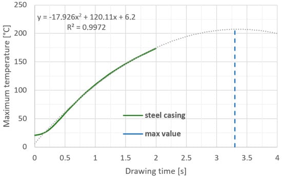 Maximum temperature of steel casing after drawing 10 m of wire.