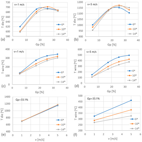 Influence of drawing parameters on the heating of drawing dies and wire: (a) die temperature in single reduction function for v = 1 m/s; (b) die temperature in single reduction function for v = 5 m/s; (c) wire temperature in single reduction function for v = 1 m/s; (d) wire temperature in single reduction function for v = 5 m/s; (e) die temperature in drawing speed function; (f) wire temperature in drawing speed function; where: v—drawing speed; Gp—single reduction; T—temperature; 2α = 6°, 10°, 14°.