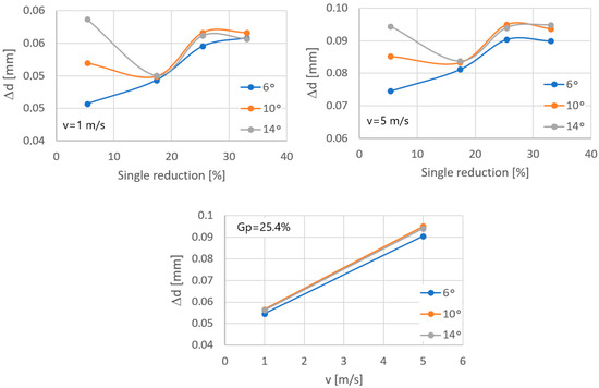 Change in the diameter of the calibrating part of the drawing die after the drawing process, where ∆d—drawing die wear expressed in mm; 2α = 6°, 10°, 14°.