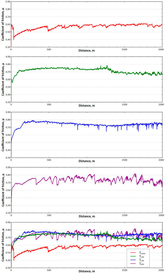 The performed tribological tests confirmed the significant influence of temperature on the friction conditions and wear of the carbide/steel friction pair. Based on the data in Table 3, it can be seen that while an initial increase in temperature to 200 °C does not result in a significant difference in friction coefficient values (a difference of approximately 3%), a considerable deterioration in lubrication conditions can be expected at temperatures above 400 °C. The differences in the values of the average friction coefficient between variants I and IV were over 30%.