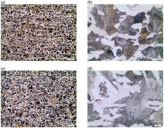 Structure of C45 steel, LM: (a) variant I, 100× magnification; (b) variant I, 1000× magnification; (c) variant IV, 100× magnification; (d) variant IV, 1000× magnification.