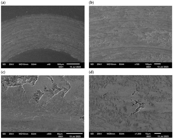 Variant II, C45 steel surface, SEM: (a) abrasion area, 40× magnification; (b) abrasion area, 100× magnification; (c) abrasion area, 500× magnification, (d) abrasion area, 1000× magnification.