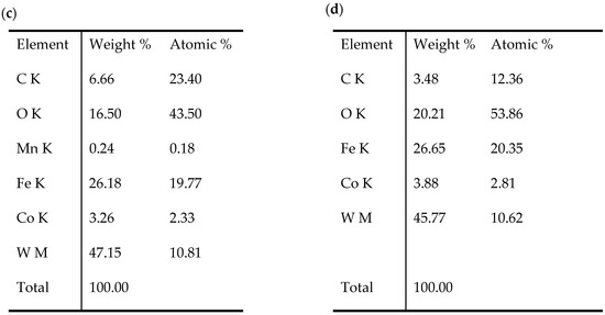 EDS analysis, C45 steel, abrasion area: (a) variant I, (b) variant II, (c) variant III, (d) variant IV.