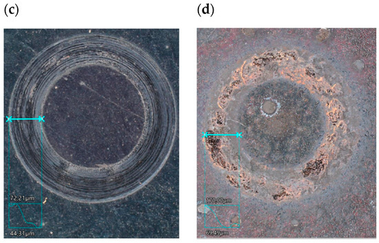 Three-dimensional (3D) image steel simples after tribological tests for (a) variant I, (b) variant II, (c) variant III, and (d) variant IV.