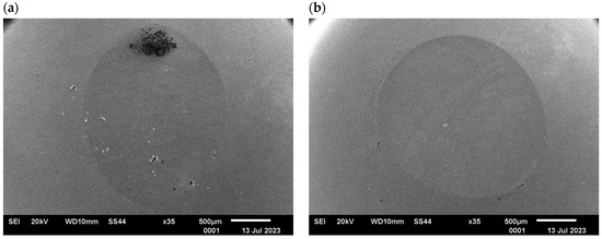 The analysis of the surface of the counter-samples (balls) confirmed the presence of typical abrasion marks; however, no surface cracks were found. The performed tests showed that in the contact area of the sample/counter-sample during tribological testing, the phenomenon of sample material deposition on the surface of the counter-sample occurs; see Figure 20. This confirms the possibility of the steel “sticking” to the surface of the drawing dies during the drawing process.