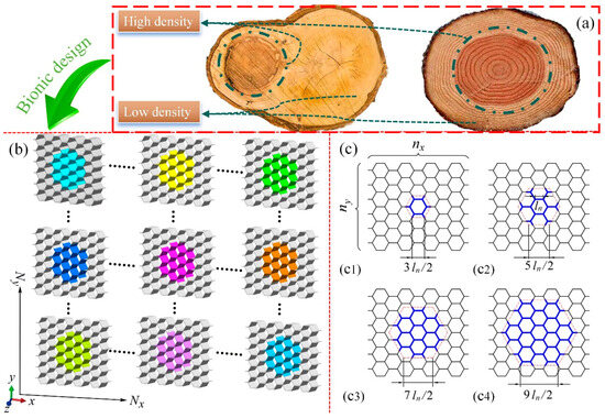 As illustrated in Figure 1a, tree trunks display a variation in density, with the center of the trunk being denser than the adjacent tissues. This phenomenon endows trees with superior mechanical properties, including enhanced resistance to toppling and impact. Inspired by the density variation in tree trunks, which provides them with exceptional mechanical strength and impact resistance, this study introduces a biomimetic variable density approach to the design of honeycomb blocks to mimic the efficient structural reinforcement seen in nature.