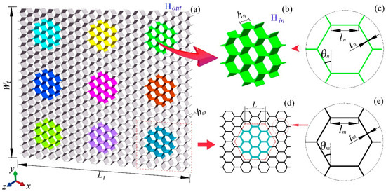 The 3 × 3 modular honeycomb structure (a), sub-honeycomb configuration (b) and geometric parameters (c), and matrix honeycomb configuration (d) and geometric parameters (e).