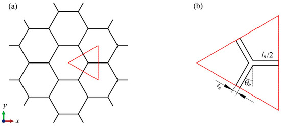 We use the BJ2 honeycomb block as an example to derive the formula for the relative density of the modular honeycomb. As illustrated in Figure 3a, the sub-honeycomb comprises 24 basic elements, each delineated by a triangular frame. Figure 3b provides a detailed view of the basic elements, along with its geometric parameters. The mass of the sub-honeycomb is equivalent to the product of the total volume of all cell walls and the density of the base material. Therefore, the total mass of the sub-honeycomb is deduced as