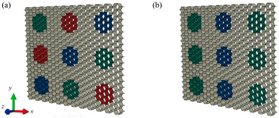 Based on the configurational rule of modular honeycombs, a diverse array of such structures can be crafted by tuning the arrangement of honeycomb blocks and modulating the wall thickness of the sub-honeycombs. Figure 4 illustrates two types of modular honeycombs, with the sub-honeycombs displayed in different colors to represent varying wall thicknesses. Despite the variances in these structural configurations, the mechanisms by which these modular honeycombs enhance impact resistance and how the wall thickness of sub-honeycombs influences the deformation modes are consistent across configurations. This section specifically examines the modular honeycomb shown in Figure 4b to delineate the methodology for constructing an in-plane compression numerical model tailored to modular honeycomb structures.