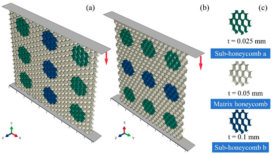 To gain a comprehensive understanding of the deformation patterns and the mechanical characteristics of modular honeycombs, a finite element analysis was conducted utilizing Abaqus/CAE|SIMULIA 2023. Figure 5a,b represent the numerical models of the modular honeycomb subjected to compression along the y- and x-directions, respectively. In Figure 5c, the dark green, metallic, and blue honeycombs represent the sub-honeycomb a, matrix honeycomb, and sub-honeycomb b, respectively, with thicknesses of 0.025 mm, 0.05 mm, and 0.1 mm.