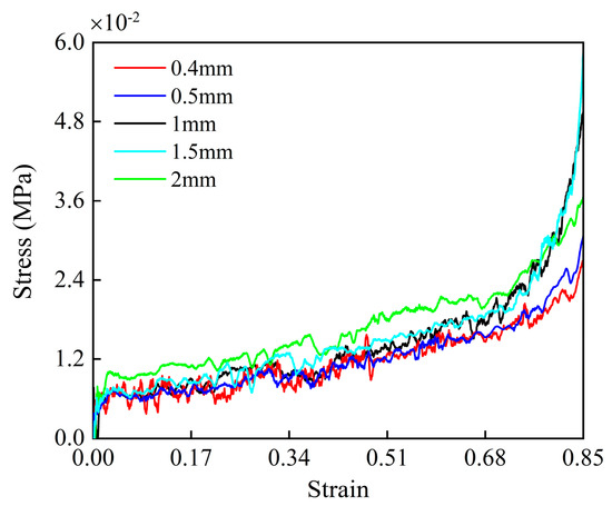 To balance the trade-off between computational time and accuracy, a mesh size convergence study was conducted for the loading condition in the y-direction. Figure 6 displays the stress–strain curves derived from simulations utilizing different mesh sizes at a loading velocity of 1 m/s. The stress–strain curves for the 0.4 mm and 0.5 mm meshes are close, suggesting that the finite element analysis reached convergence with a mesh size of 0.5 mm. Therefore, the 0.5 mm mesh size is selected for the subsequent computational simulations.