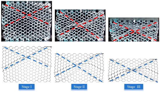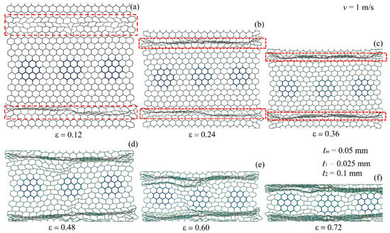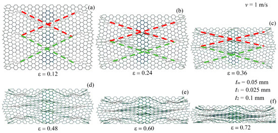 The deformation modes of the modular honeycomb during y-directional low-velocity compression are depicted in Figure 8. The thin-walled sub-honeycombs deform before the thick-walled counterparts. Upon reaching a strain of approximately 0.12, the thin-walled sub-honeycombs experience significant plastic deformation. At this stage, the modular honeycomb exhibits two vertically aligned X-shaped deformation bands along the lines connecting the thin-walled sub-honeycombs, while the thick-walled sub-honeycombs remain largely undeformed.