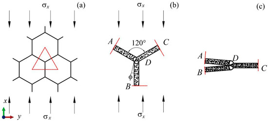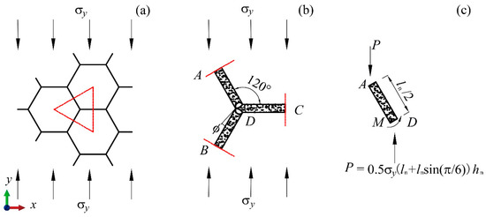 Figure 10a presents the free-body diagram for a part of the sub-honeycomb during compression in the y-direction, while Figure 10b delineates the free-body diagram of the basic unit, highlighted by the red triangular area in Figure 10a. Figure 10c illustrates the force condition along strut AD. From the equilibrium of forces, it is deduced that the expression for the equivalent external force exerted on AD is as follows: