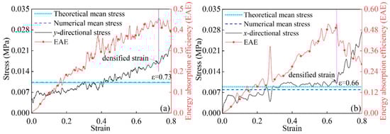 Figure 12a illustrates the numerical stress and energy absorption efficiency for the structure under y-direction low-velocity impacts, complemented by the comparison of numerical and theoretical average stresses. Figure 12b corresponds with the results for low-velocity compression along the x-direction. The substantial agreement between the numerical and theoretical stresses validates the precision of the theoretical approach in forecasting the plateau stress for the modular honeycomb under quasi-static compression.