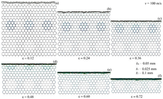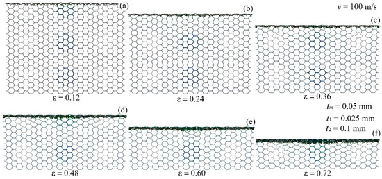 Figure 13 depicts the deformation of the modular honeycomb subjected to high-velocity compression (100 m/s) along the y-direction. The honeycomb demonstrates a consistent deformation pattern, marked by the emergence of I-shaped collapse bands at the end of the impact. These bands extend progressively in the direction of compression. At strains of 0.12, 0.24, 0.36, 0.48, 0.60, and 0.72, deformation is concentrated at the impact end, with the cells at the stationary end remaining undeformed. It is noteworthy that despite variations in wall thickness among the thin-walled sub-honeycombs, thick-walled sub-honeycombs, and the matrix honeycomb, there is no significant variation in the deformation mode under high-velocity impact.