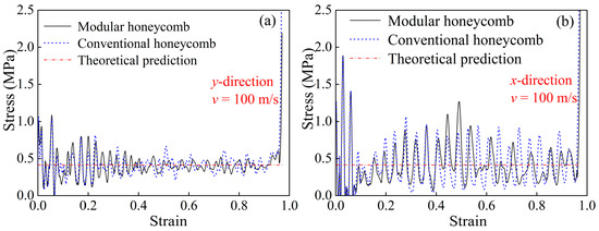 The stress–strain curves of the modular honeycomb and the conventional honeycomb under the impact velocity of 100 m/s, (a) y-direction, (b) x-direction.