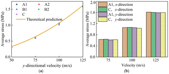 Figure 16a presents the plateau stress of honeycombs subjected to y-directional impacts at velocities ranging from 50 m/s to 125 m/s. Honeycombs with identical relative densities display comparable plateau stresses at a given velocity, aligning well with the theoretical predictions from Equation (19). Figure 16b compares the plateau stresses for honeycombs A1 and C under compression along the x- and y-directions at velocities of 75 m/s, 100 m/s, and 125 m/s. The bar chart underscores a negligible difference in plateau stress between the modular and conventional honeycombs of the same density. It also indicates that the variation in plateau stress for modular honeycombs under high-velocity impacts in both directions is slight. The study affirms the validity of employing the plateau stress formula for conventional honeycombs under high-velocity impacts to estimate the plateau stress of modular honeycombs under similar conditions.