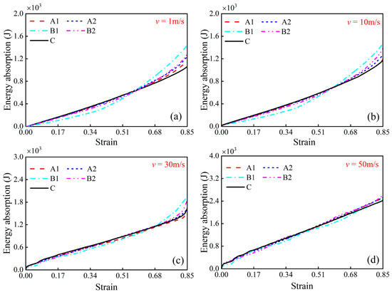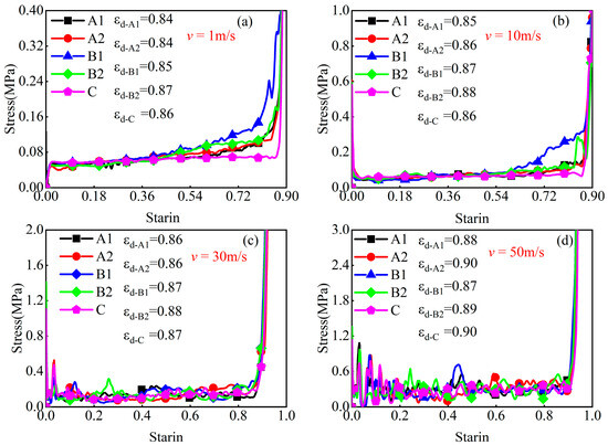 in which, and represent the plateau stresses under dynamic and static compression, respectively. The term denotes the dynamic component, reflecting the influence of inertia and velocity on the dynamic plateau stress. is the impact velocity, and is the coefficient of the dynamic term, which can be estimated as follows: