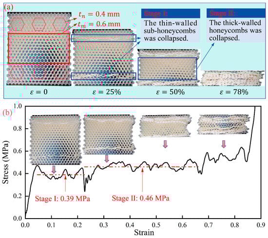 The stress–strain curve also exhibits two-stage plateau stress in Figure 19b. The first plateau stress corresponds to the compression deformation of the thin-walled sub-honeycombs, with a stress of 0.39 MPa, while the second plateau corresponds to the deformation phase of the thicker-walled honeycomb, with a stress of 0.46 MPa. Subsequently, the compression process transitions into a densification phase. The phenomena can be attributed to the low relative density and correspondingly lower load-bearing capacity of the thin-walled sub-honeycombs, which makes them more susceptible to collapse. Drawing inspiration from this mechanism, it is possible to tailor a modular honeycomb with multi-stage mechanical response and determine their respective deformation modes by adjusting the layout and the wall thickness of sub-honeycombs.