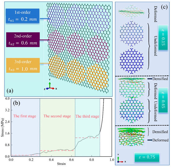 Design of a modular honeycomb with three-stage plateau stress: (a) geometric model, (b) stress–strain curve, (c) deformation process.