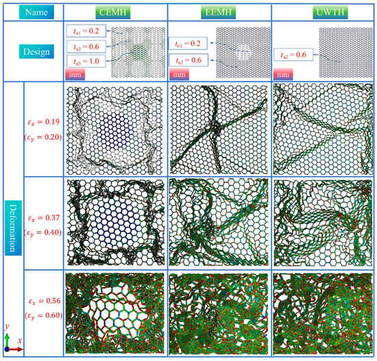 This section introduces the design of two distinct types of modular honeycombs, aimed at demonstrating the potential for customization in their response to biaxial compression. The first variant is the central enhanced modular honeycomb (CEMH), which features a central sub-honeycomb wall measuring 1.0 mm in thickness, surrounded by thinner sub-honeycomb walls at 0.2 mm, and a matrix honeycomb wall thickness of 0.6 mm. The second variant, the external enhanced modular honeycomb (EEMH), inverts this design, with a central sub-honeycomb wall of 0.2 mm thickness complemented by matrix and other sub-honeycomb walls at 0.6 mm. For comparative analysis, a uniform wall thickness honeycomb (UWTH) with a consistent 0.6 mm wall thickness across all components is also presented, as illustrated in Figure 21. The dimensions of these honeycombs in the x- and y-axes are 180.0 mm and 166.3 mm, respectively. Figure 21 presents a comparative study of the deformation modes of these honeycombs under biaxial compression at longitudinal strains of 0.2, 0.4, and 0.6. At a strain of 0.2, the CEMH exhibits significant plastic deformation in the thinner sub-honeycomb walls, while the central region with 1.0 mm wall thickness remains largely undeformed. Conversely, the central sub-honeycomb compacts in the EEMH, creating distinct compaction bands radiating outward. The UWTH displays a disorder deformation mode. As the strain increases to 0.4, the thinner sub-honeycombs in the CEMH are fully compacted, and the matrix honeycomb is severely deformed, yet the central sub-honeycombs with 1.0 mm wall thickness remain largely intact. The EEMH shows more pronounced compaction bands, while the UWTH becomes increasingly disordered. At the strain of 0.6, the central sub-honeycombs in the CEMH, despite not being fully compacted, are surrounded by a fully dense matrix and sub-honeycombs. Both the EEMH and UWTH achieve a state of complete compaction.