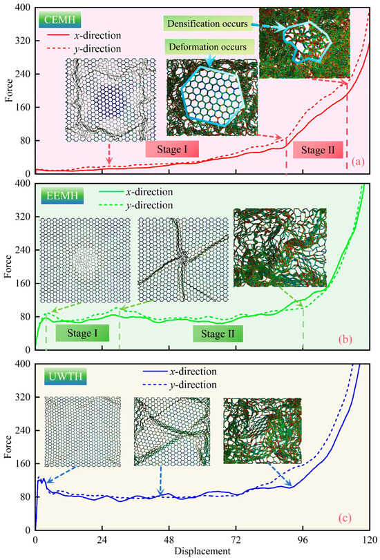 The x- and y-directional force–displacement curves of (a) CEMH, (b) EEMH, and (c) UWTH under biaxial compression.