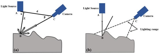 The principle of laser triangulation for the LS-40 equipment (a) Laser beam came from a known angle of the instrument, (b) Measurement points exceeding the measurement range of the instrument.