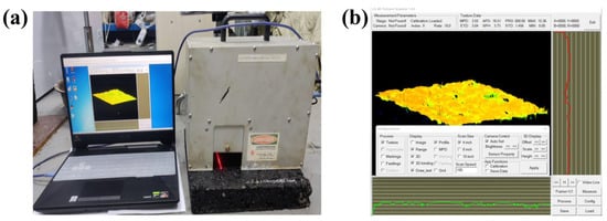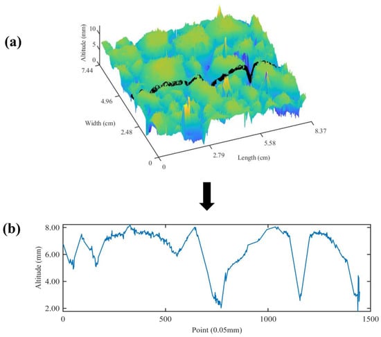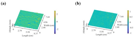 The LS-40 equipment collected the linear profile from the target surface. Each measurement scanned a total of 2048 profiles, and each profile line contained 2048 data points, which covered an area of 10.16 cm × 11.43 cm with a horizontal accuracy of 0.05 mm. The LS-40 equipment could measure the elevation texture information within 12.5 mm of the top and bottom of the surface because the instrument was placed on a surface of the specimen with a vertical accuracy of 0.01 mm []. The scanning results were displayed in the form of elevation data, which is illustrated in Figure 3.