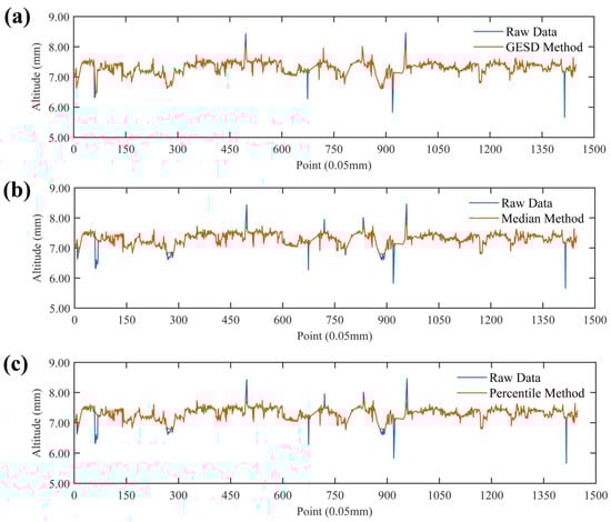 Figure 5 demonstrates the comparative effect of each outlier identification method, and it can be seen that the median and parametric methods identify part of the pavement textures contour information as outliers in the process of identifying the pavement texture outliers, while the GESD method can accurately identify the outliers of pavement textures and the elevation profile information of pavement textures is relatively completely preserved compared with the median and parametric methods. Therefore, the outlier recognition effect is better.