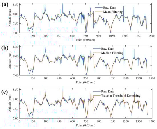 Figure 6 compares the filtering effects of mean and median filtering and wavelet threshold denoising. As shown in Figure 7, the wavelet threshold denoising is the closest to the original signal, and retains most of the characteristics of the original signal, which also leads to incomplete filtering of the wavelet threshold denoising such as some glitches. Both mean and median filtering can eliminate the glitch points, and the median filter is in the middle of the wavelet threshold denoising and mean filtering to the extent that it is close to the original signal. The mean filtering is calculated by the average value of all elements in the window. This will discard signal details in the filtering process, and the image is blurred in a larger range. Therefore, the median filtering retains more original details than the mean filtering.