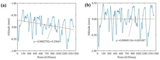 where i is the number of the contour elevation data point; Hi is the slope correction contour elevation corresponding to number i; hi is the height of the original contour corresponding to number i; N is the total number of collection points for the contour line; b1 is the elimination coefficient of slope error, which can be calculated as Equation (6); and b0 is the bias error item calculated by Equation (7). The pavement profile before and after the eliminated slope error and offset error are demonstrated in Figure 7.