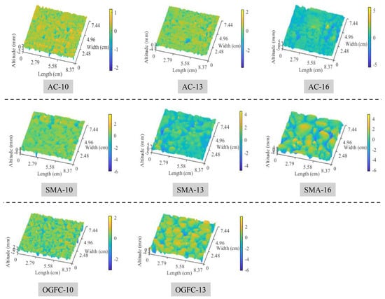 The asphalt pavement surface texture is reconstructed after intercepting the collected original texture data, identifying and replacing outliers, filtering to remove noise signals, and inclination correction []. Figure 8 illustrates the three-dimensional reconstructed surfaces for various types of specimens, and it can be seen that the height distribution becomes uneven as the types of specimen changes from the AC to OGFC specimen, and the OGFC-13 specimen presents the largest elevation difference in the same reconstructed surface.