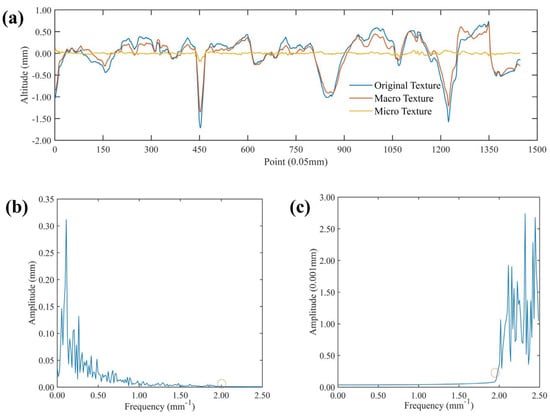 Pavement macro- and micro-texture separation and frequency domain map of (a) the contour line, (b) the frequency domain of the macro-texture, and (c) the frequency domain of the micro-texture from AC-13.
