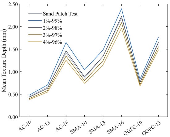 During this process, the parametric points of the overall data are considered as the upper and lower limits of the rectangular frame. It was reported that the sand patch method could also be used to exactly calculate MTD, but the experimental process is not easy to operate manually compared with the Monte Carlo expectation method, and the calculation process could be found in previous literature [,]. Therefore, Figure 11 compares the MTD obtained by the sand patch method and the Monte Carlo expectation method with different parametric points. From Figure 12, the MTD calculated by the Monte Carlo expectation method is the closest to that obtained by the sand-laying method because the 98% and 2% parametric points are used as the upper and lower boundaries of the rectangular box, and more original elevation data information are retained at the same time. Therefore, the 98% and 2% parametric points of the overall data are used as the upper and lower limits of the Monte Carlo expectation method in this paper.