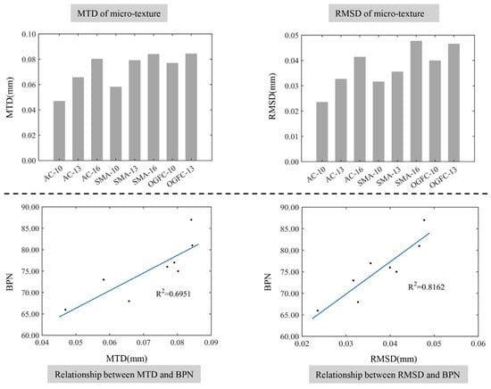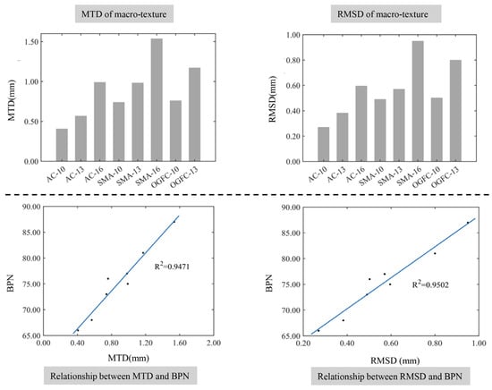 Figure 13 illustrates the height characteristic parameters of the macro-texture for different graded asphalt mixture specimens and their relationship with the BPN. It can be seen from Figure 14 that the MTD of the texture is consistent with the RMSD of the profile, and both show characteristics that are significantly related to the gradation type of the mixture and the maximum nominal particle size. The MTD and RMSD of the macroscopic texture increase with the increase in the maximum nominal particle size for mixtures with the same gradation type. The macro-texture height of the open-graded pavement is greater than that of the dense-graded pavement, which shows this order as OGFC > SMA > AC for the same maximum nominal particle size. At the same time, the BPN of asphalt pavement shows a significant positive correlation with the macro-texture height parameters. As the height of the macro-texture increases, the skid resistance of the pavement improves, which is due to the increased height of the macro-texture of asphalt pavement increasing the unevenness of the pavement surface and the energy loss increases using the elastic hysteresis in friction between the tire and the pavement. The fitting coefficient of the RMSD and the BPN is slightly larger than that of the MTD and the BPN, which indicates that Rq exhibits a more significant correlation with the BPN than the MTD. This can be attributed to the convex part of the pavement surface mainly affecting the elastic hysteresis and the RMSD amplifying the profile offset distance of the convex part.
