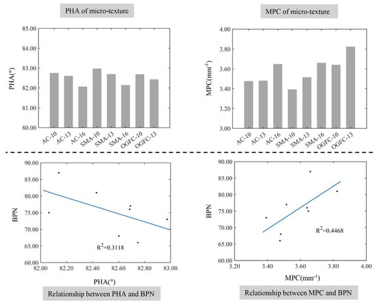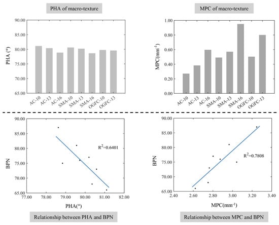 The relationships between the shape characteristic parameters of macro-texture protrusions and the BPN of different graded asphalt mixture specimens are demonstrated in Figure 14. The PHA and MPC also show a significant correlation with the mixture gradation and maximum nominal particle size. The profile peak of the pavement macroscopic texture is mainly caused by the irregular shape of the aggregate, and asphalt pavement tends to form a sharper convex peak as the proportion of the coarse aggregate or particle size of the aggregate is large, which leads to the larger MPC and smaller PHA. The increased amount of fine aggregate in the mixture leads to the larger PHA and a smaller MPC. This can be explained by the small and dense voids being easier to form on the surface of the pavement, and it is not easy to form a protruding profile peak. Interestingly, there is a negative correlation between the PHA and the BPN, and the fitting coefficient R2 is 0.6401. The MPC and BPN has a positive relationship, whose fitting coefficient R2 is 0.7808. On the one hand, the sharper macro-texture profile peak can lead to a greater contact stress and an increased elastic hysteresis generated during the contact between the rubber and the pavement surface. On the other hand, the increased sharpness of the macro-texture profile peak will cause a decrease in the contact area, which in turn reduces the frictional resistance caused by the adhesion.