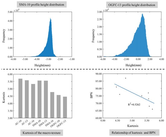 Figure 15 illustrates the relationship between the macro-texture comprehensive distribution characteristics and the BPN. It can be seen from Figure 15 that the elevation distribution of the surface profile for SMA-10 is more concentrated than that of OGFC-13, which is attributed to the fact that the kurtosis of the macro-texture for SMA-10 is greater than that of OGFC-13. The steeper elevation data of the pavement contour indicates that most of the contour elevations are distributed around mean values, and there are fewer elevation data deviated from the mean value. It can also be concluded that the kurtosis of the macroscopic texture is related to the gradation of mixture and the maximum nominal particle size. The kurtosis of the macro-texture for open-graded asphalt pavement is smaller than that of dense-graded asphalt pavement, which indicates that the distribution of data furthest from the mean is more dispersed in the elevation data of the open-graded pavement profile. This is consistent with the performance of larger void depths on open-graded pavement surfaces. The kurtosis of the macro-texture for asphalt pavement decreases slightly as the maximum nominal particle size increases, which can be explained by the increase in the amount of coarse aggregate leading to an increase in the amount of protruding aggregate on the pavement.