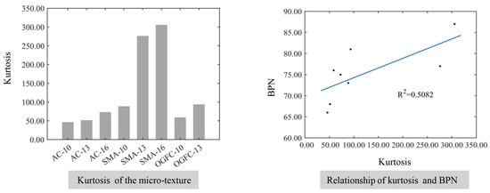 The relationship between the comprehensive distribution characteristics of the micro-texture and the BPN is shown in Figure 18. The kurtosis of the microscopic texture increases with the increase in the maximum nominal particle size, which is different from the kurtosis of the macroscopic texture. This can be explained by the microscopic texture of the pavement mainly describing the microstructure of the aggregate surface and the structure of the surface for large aggregates is relatively uniform and single compared with the variety of microstructures in the small size of aggregates. Therefore, the elevation distribution of microscopic texture is more concentrated with an increase in the maximum nominal particle size. In addition, the kurtosis of the micro-texture for the SMA-type mixtures is significantly greater than that of the AC and the OGFC due to the covering effect of fine aggregates and asphalt on the surface structure of coarse aggregates. At the same time, the fitting coefficient R2 between the kurtosis of the micro-texture and the BPN is 0.5082, which indicates that the kurtosis of the micro-texture has little effect on the skid resistance of the pavement surface.