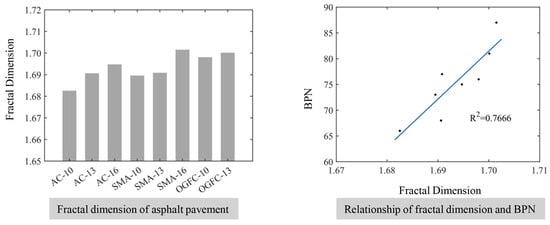 The fractal dimension of asphalt pavement reflects the irregularity of the pavement topography and self-similarity on a certain level []. Figure 19 illustrates the relationship between the fractal dimension of the pavement surface and the BPN. It can be seen that the fractal dimension of asphalt pavement is related to maximum nominal particle size and gradation type of the asphalt mixture, and the BPN increases as the fractal dimension increases, which indicates that an increased fractal dimension enhances the skid resistance. This can be attributed to the complexity of the pavement surface topography increasing and the texture topography becoming richer when the irregular bump distribution of the pavement increases. Interestingly, the roughness of the pavement increases with an increase in the macroscopic texture because microscopic texture of the pavement is not much different. When the maximum nominal particle size of the mixture increases or the gradation becomes sparser, the textures become coarser and the degree of self-similarity for surface topography increases, which leads to the increase in fractal dimension and an improvement of the skid resistance for asphalt pavement.